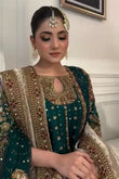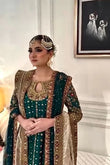 Eshal — A deep emerald ensemble adorned with antique gold and subtle marooon accents. The matching green dupatta, edged in ornate red/maroon borders, drapes in regal elegance, completing a look steeped in timeless tradition and quiet grandeur.