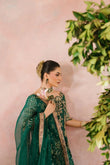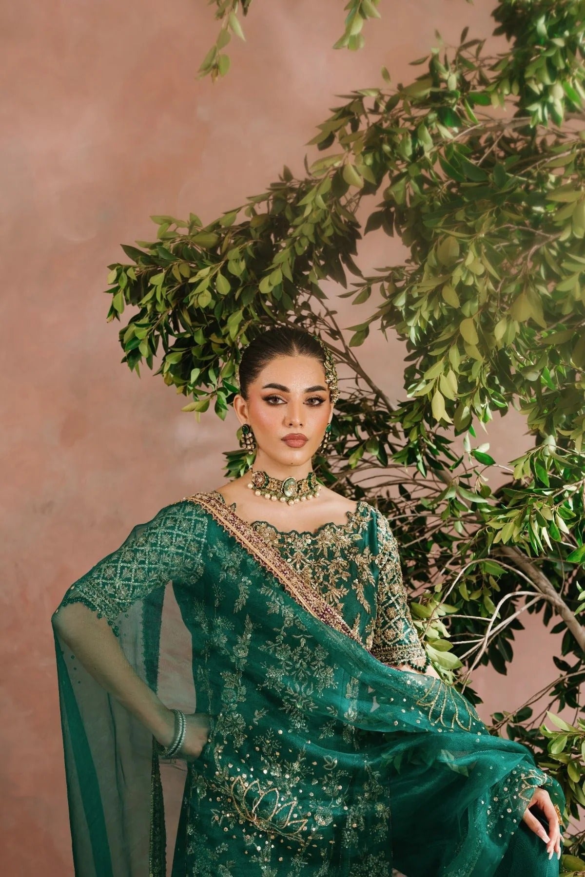 A traditional outfit perfect for a royal event consisting of a pure sheeshsa silk shirt heavily embellished with intricate zardozi work and paired with a heavy dopatta with heavy embellishment and pants that are also embellished with the same technique.