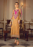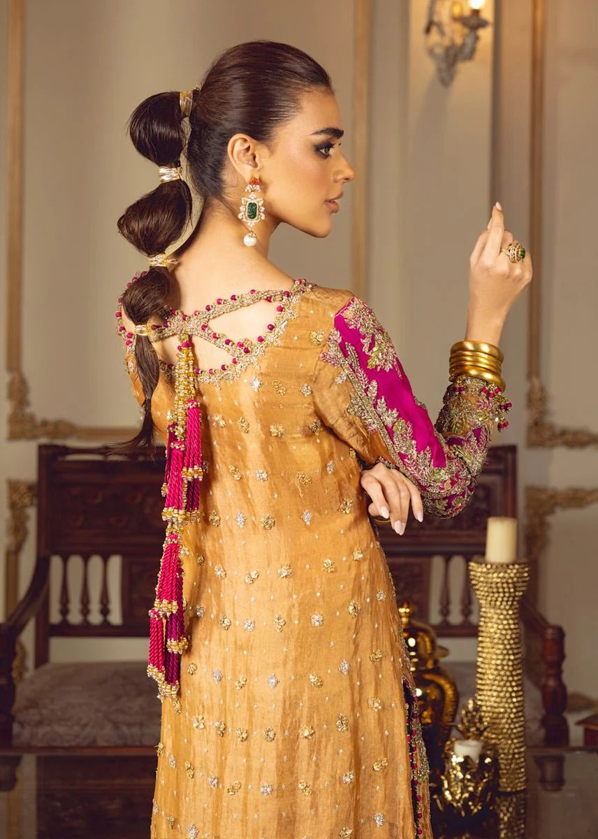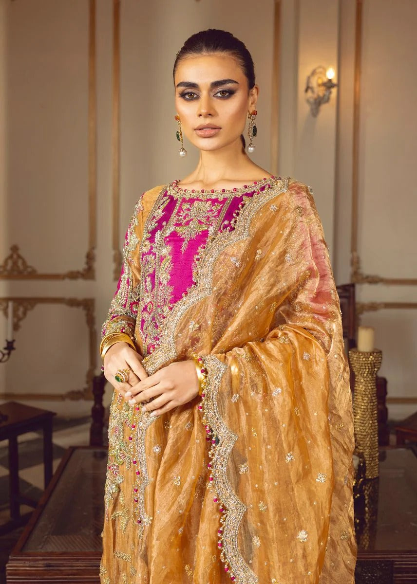 Yusra emerges like a spectral bloom created with pure tissue in pale tangerine tone adorned with ethereal floral motifs paying homage to tales of ancient traditions. The ensemble celebrates old school elegance with each taanka laden carefully on the eclectic appliques creating a myriad of colors amalgamating convention with modernity. The turquoise green raw silk pants break the monotone of color and fabric exuding festivity and a mood of color and happiness.